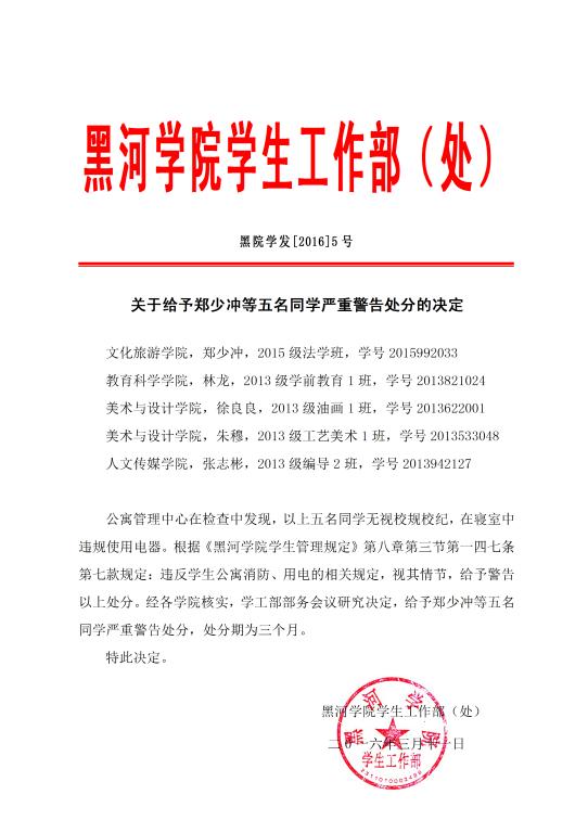 2016[5]号关于给予郑少冲等五名同学严重警告处分的决定