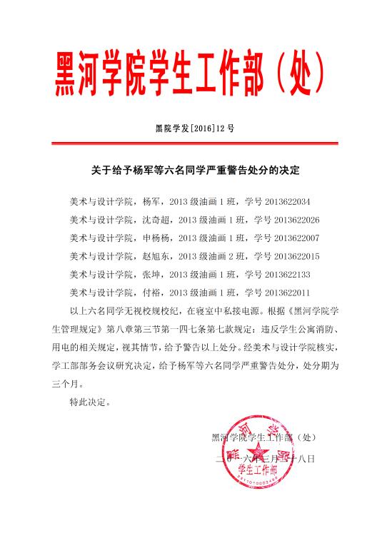 2016[12]号关于给予杨军等六名同学严重警告处分的决定
