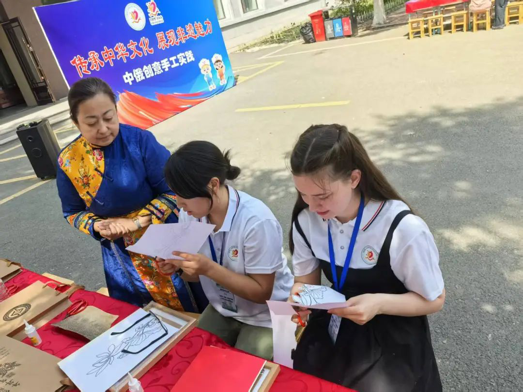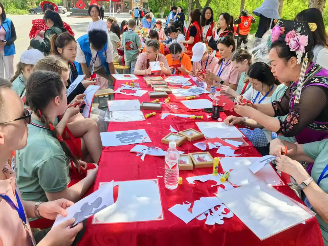 本次活动以“创意手工实践”为核心,精心设置了6个非遗手工体验区。满族剪纸体验区,在黑龙江省满族民间剪纸非遗传承人齐英老师的带领下,中俄青年学习并动手创作了富有浓郁民族特色的剪纸作品,感受纸张在指尖幻化出的艺术生命力。