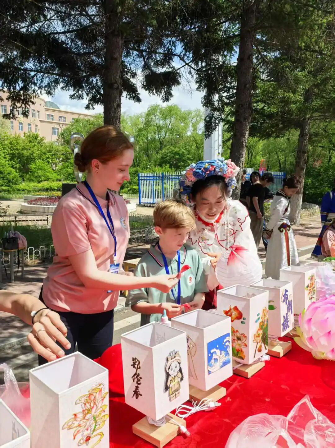 瑷珲花灯体验区,由瑷珲花灯市级非遗传承人、本次活动主持人、教育科学学院曹馨月主任亲自传授瑷珲花灯的制作技艺。中俄学生共同学习扎制、裱糊等步骤,一盏盏融合中俄学生巧思的花灯逐渐成型,象征着友谊的光芒。